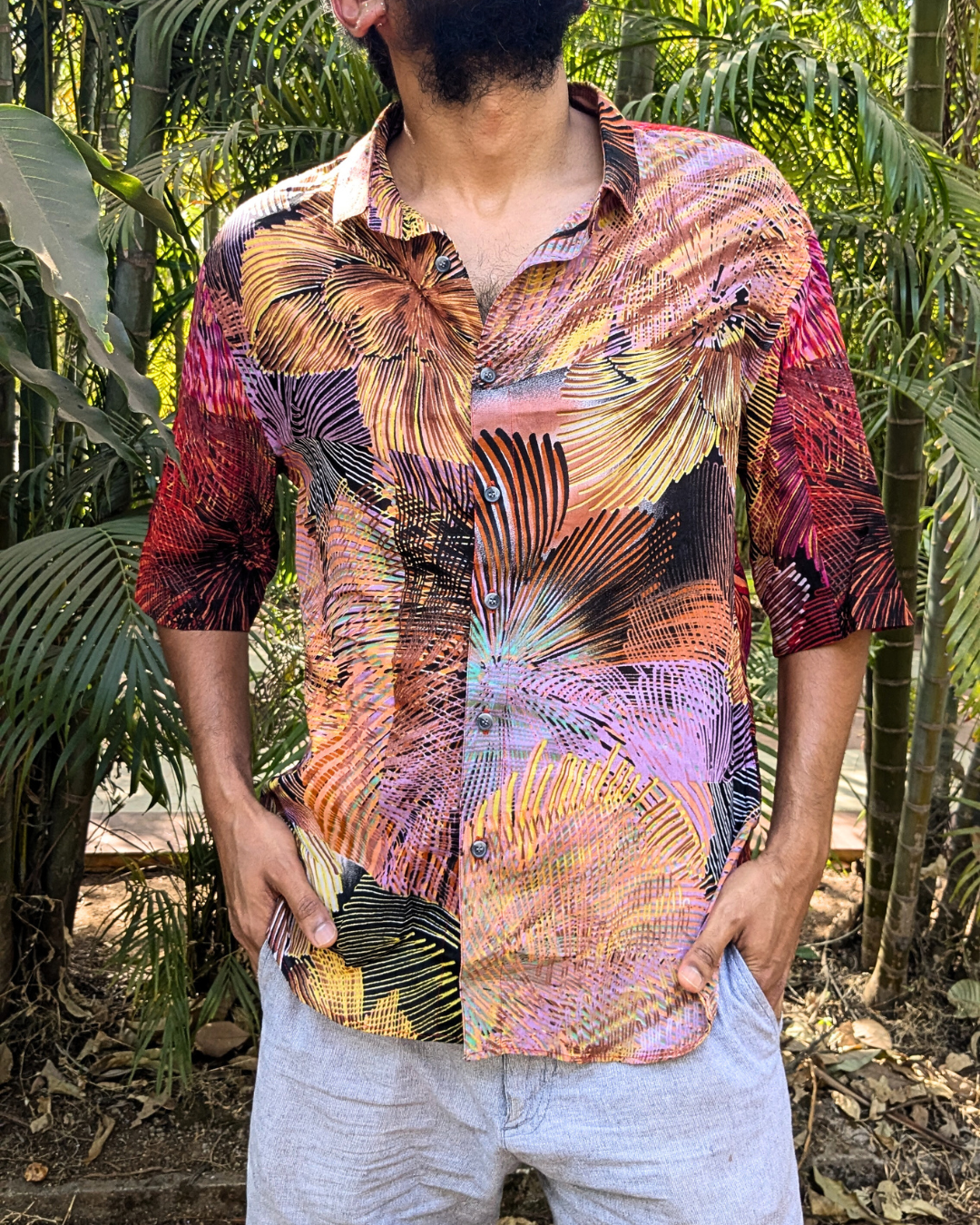 Meticulously crafted from upcycled cotton voile, this lightweight showstopper combines bold artistic expression with conscious fashion. The radiating palm-inspired pattern creates a stunning visual rhythm that's striking.